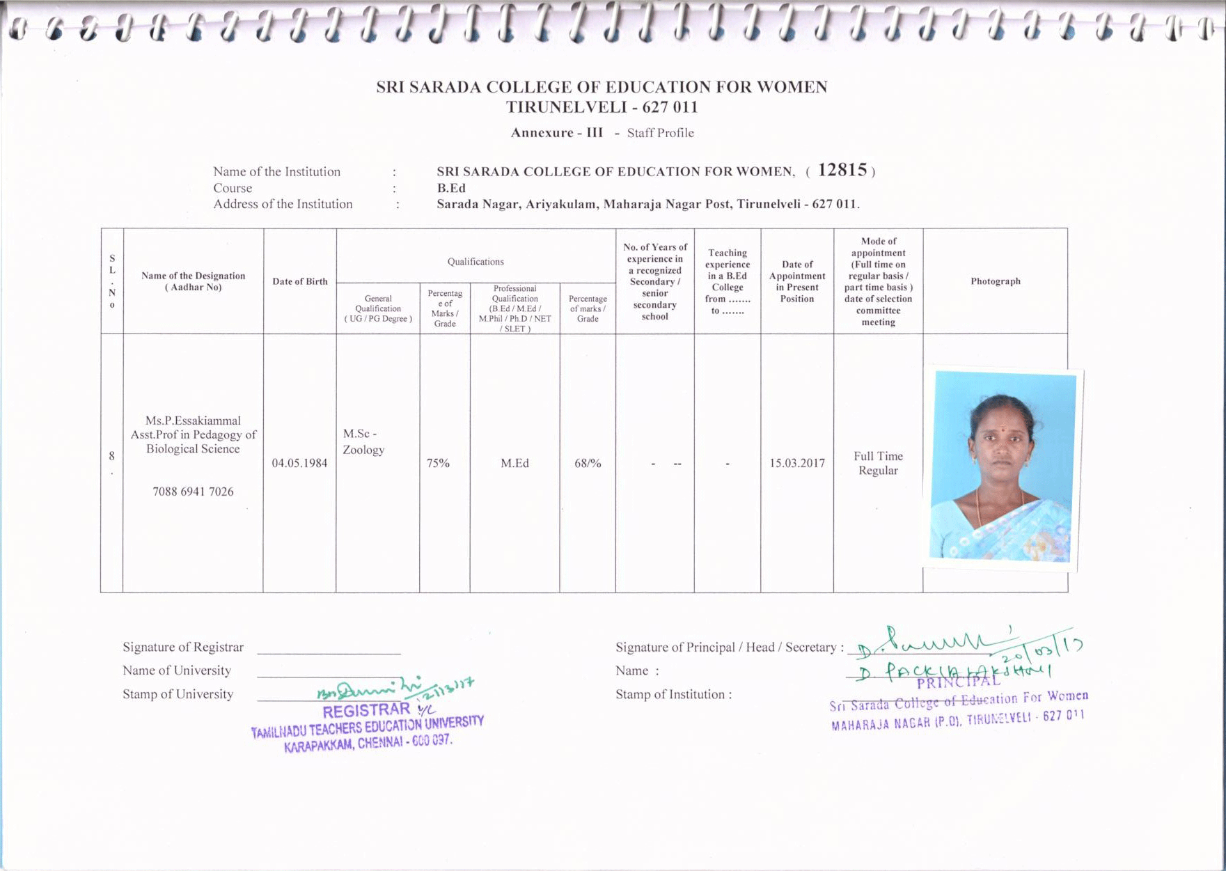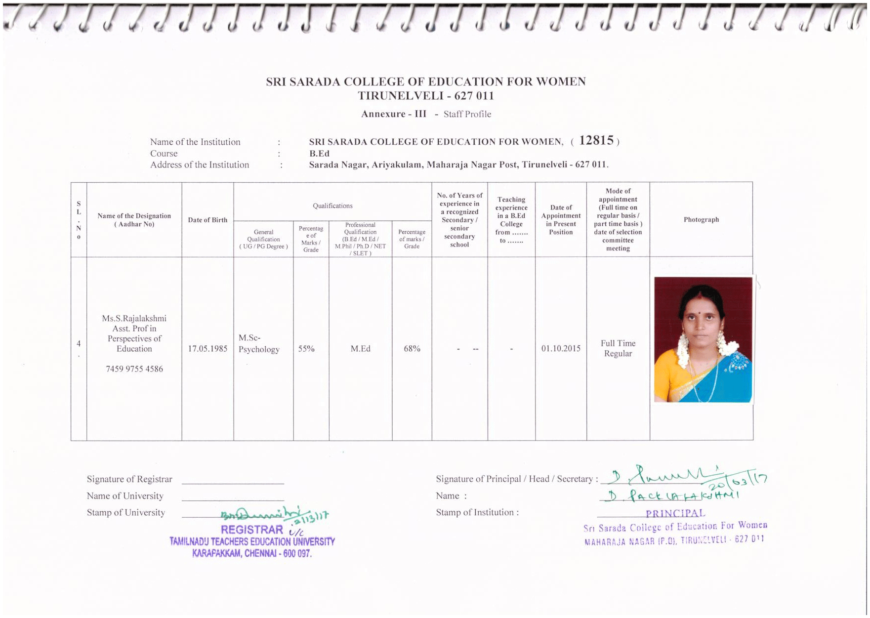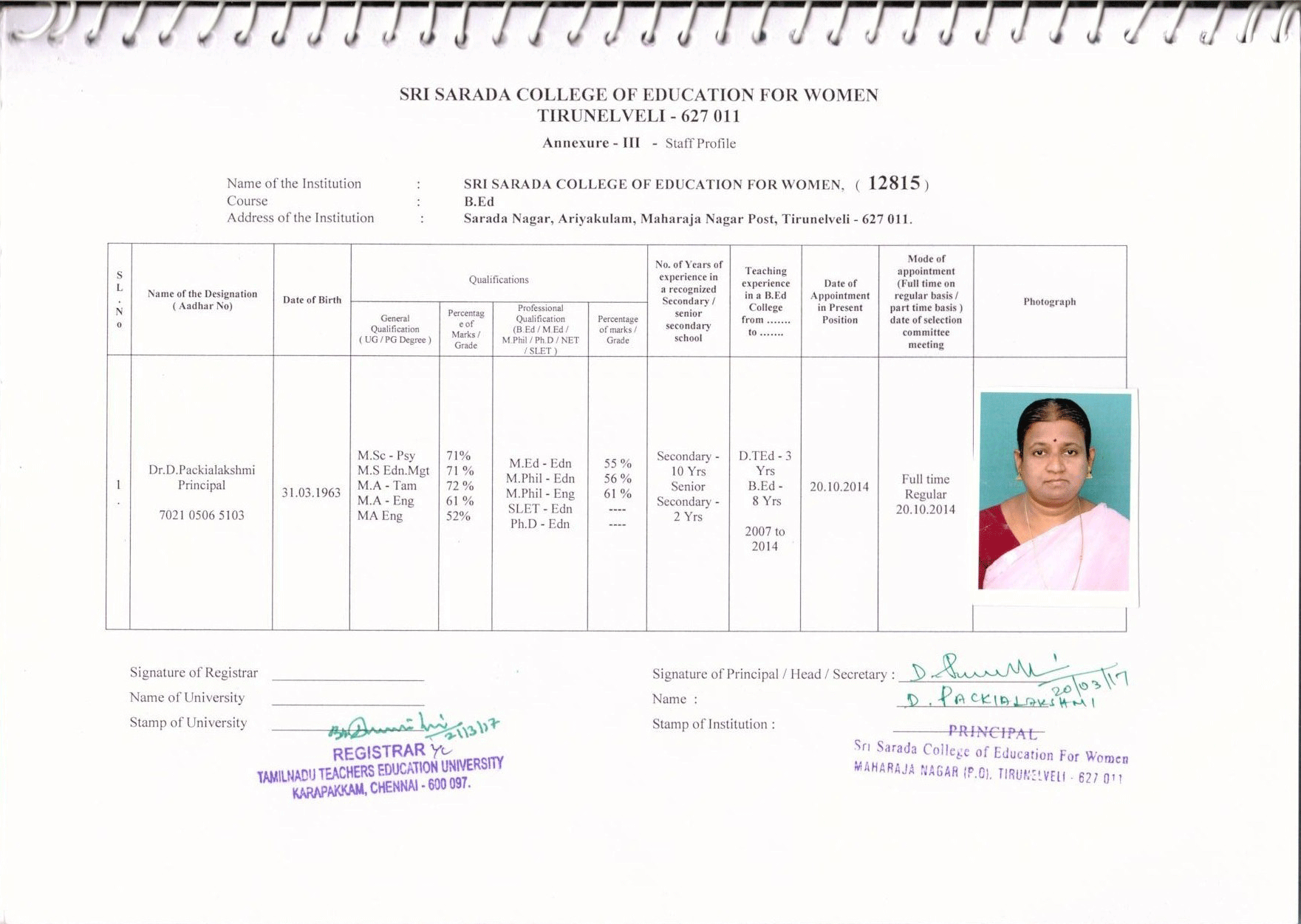 Dr. D. Packialakshmi | M.A(Eng)., M.Sc(Psy), M.A(Tam). M.A (Edu.Mgt) M.Ed, M.Phil(Edu), M.Phil (Eng), Ph.D(Edu), SLET(Edu). |
