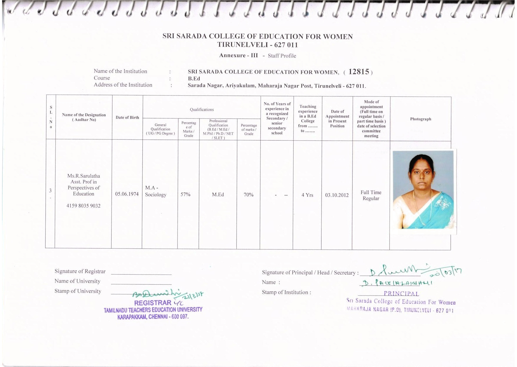 Smt. R. Sarulatha | M.Sc(Zoo)M.A (Soc) M.Phil(Zoo), SET(Edu) |